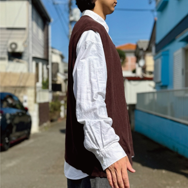 ニットベストに相性抜群な襟付きシャツはもちろん、カットソーを合わせていただいても、様になる着こなしをお楽しみいただけます!