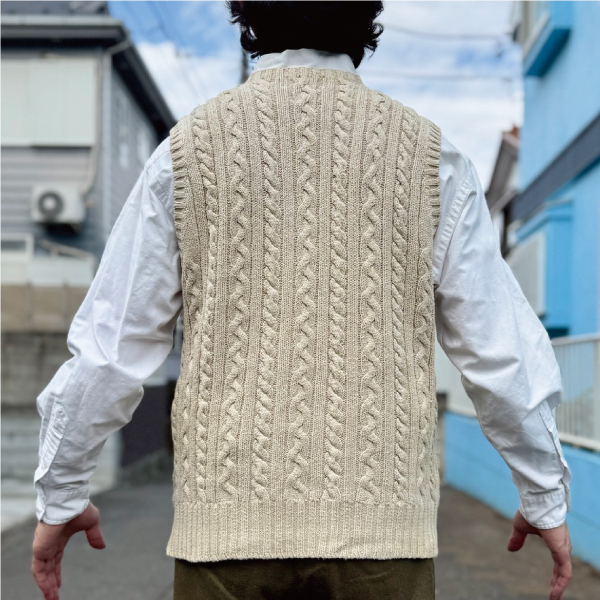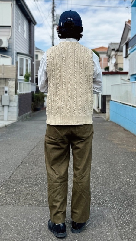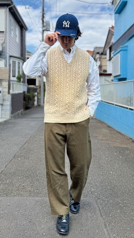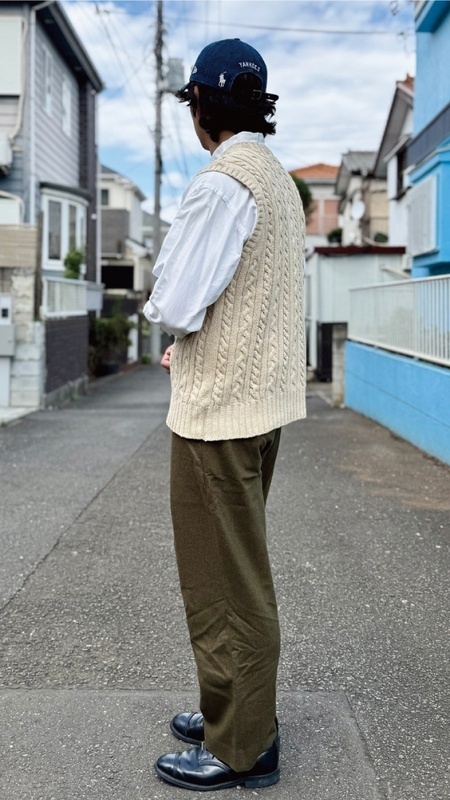 ニットベストに相性抜群な襟付きシャツはもちろん、カットソーを合わせていただいても、様になる着こなしをお楽しみいただけます!