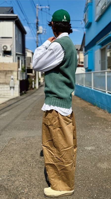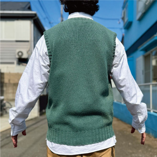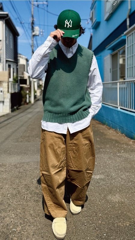 ニットベストに相性抜群な襟付きシャツはもちろん、カットソーを合わせていただいても、様になる着こなしをお楽しみいただけます!