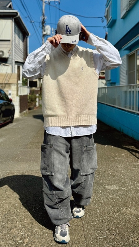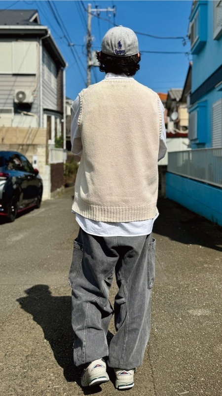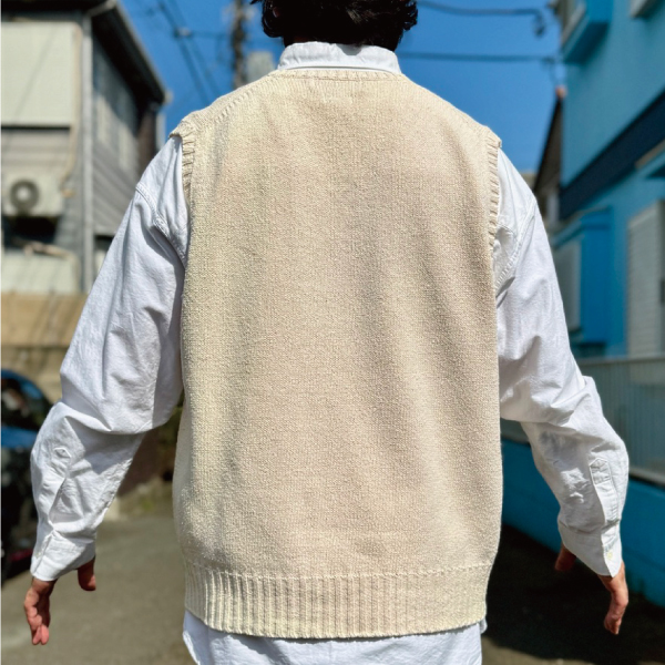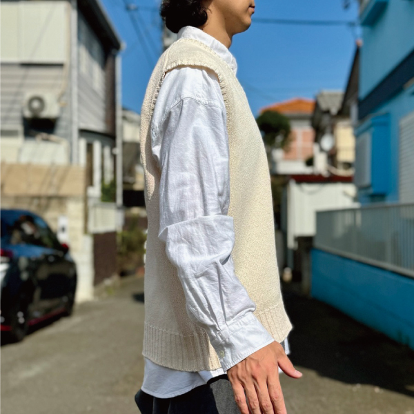ニットベストに相性抜群な襟付きシャツはもちろん、カットソーやトレーナー、パーカーなどを合わせていただいても、様になる着こなしをお楽しみいただけます!