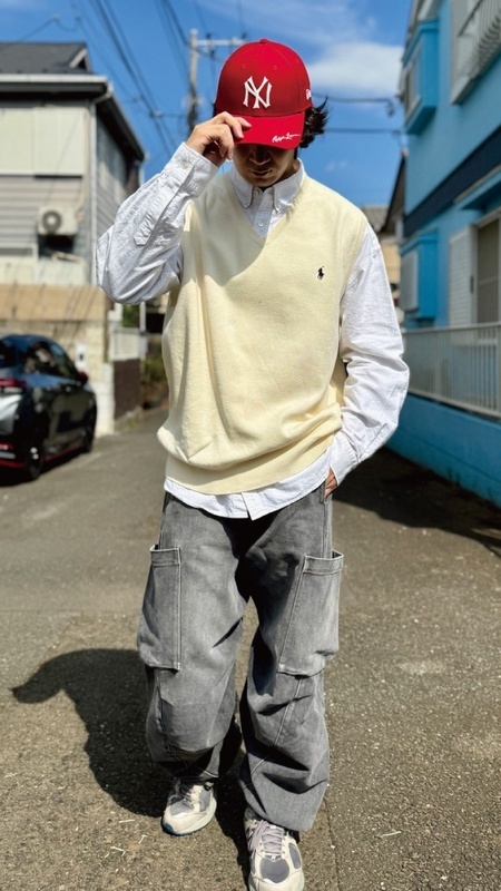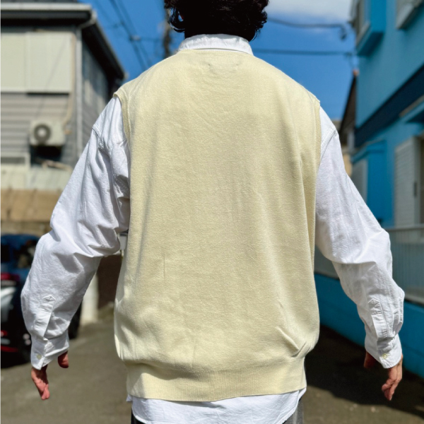 ニットベストに相性抜群な襟付きシャツはもちろん、カットソーやトレーナー、パーカーなどを合わせていただいても、様になる着こなしをお楽しみいただけます!