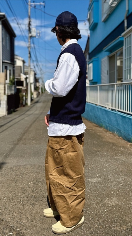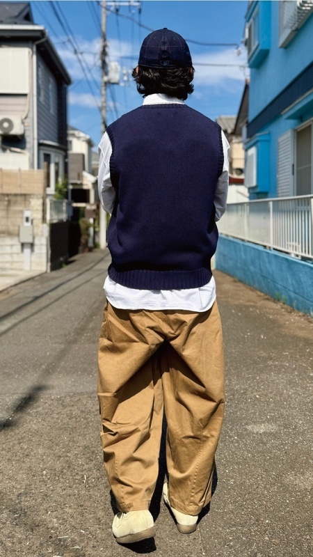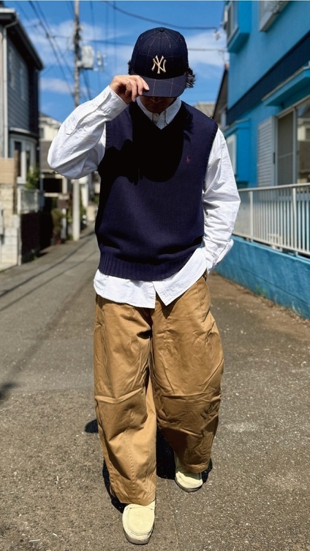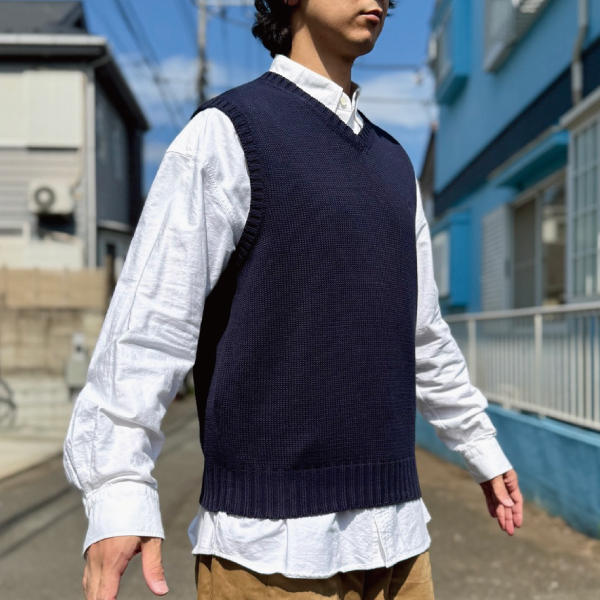 ニットベストに相性抜群な襟付きシャツはもちろん、カットソーを合わせていただいても、様になる着こなしをお楽しみいただけます!