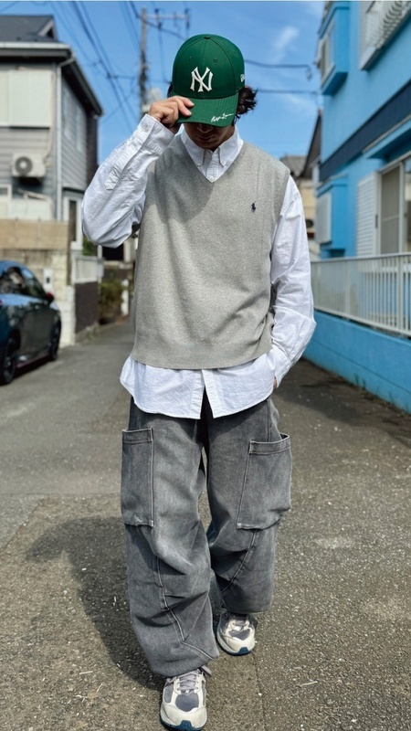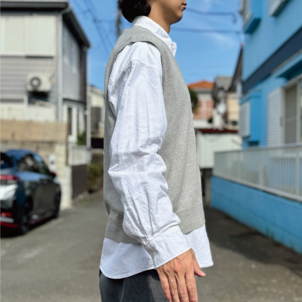 ニットベストに相性抜群な襟付きシャツはもちろん、カットソーやトレーナー、パーカーなどを合わせていただいても、様になる着こなしをお楽しみいただけます!