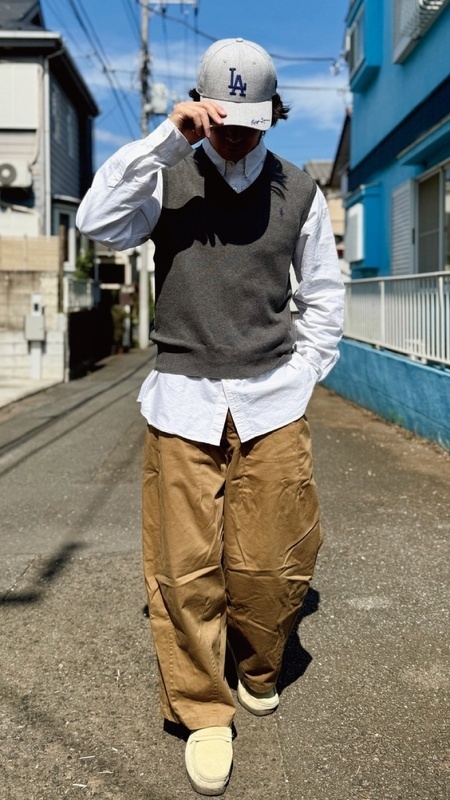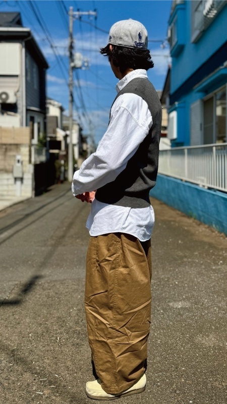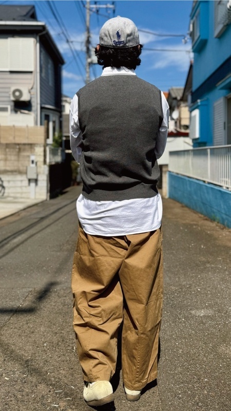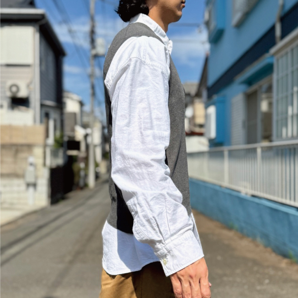 ニットベストに相性抜群な襟付きシャツはもちろん、カットソーを合わせていただいても、様になる着こなしをお楽しみいただけます!