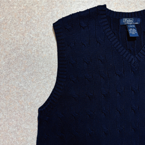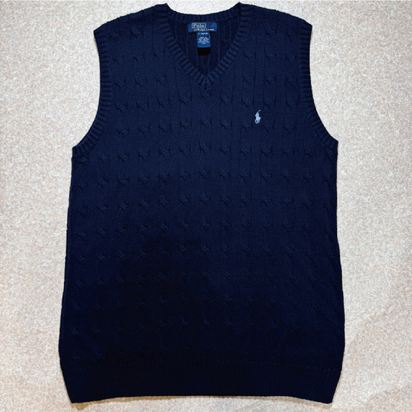 「Polo by Ralph Lauren (ポロラルフローレン)」90s 00s 10s ボーイズ L(16/18) Mサイズ相当 コットン ネイビー ケーブル編み ポニー刺繍 ニット ベスト
