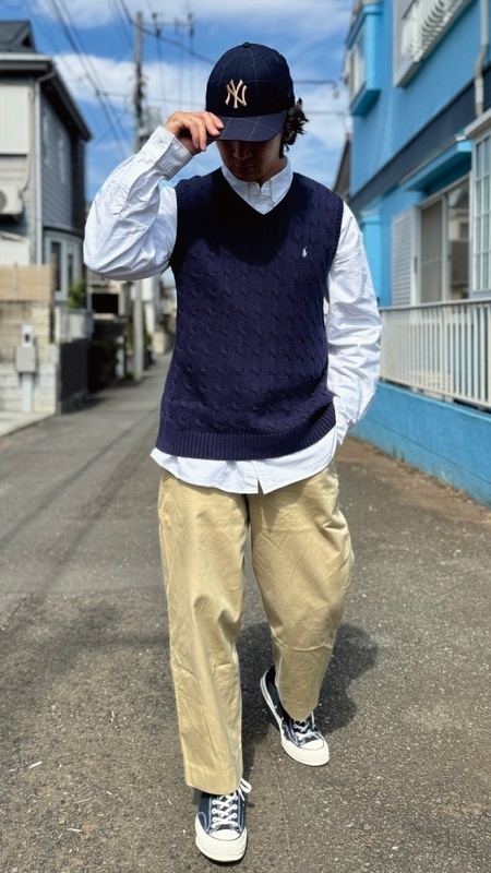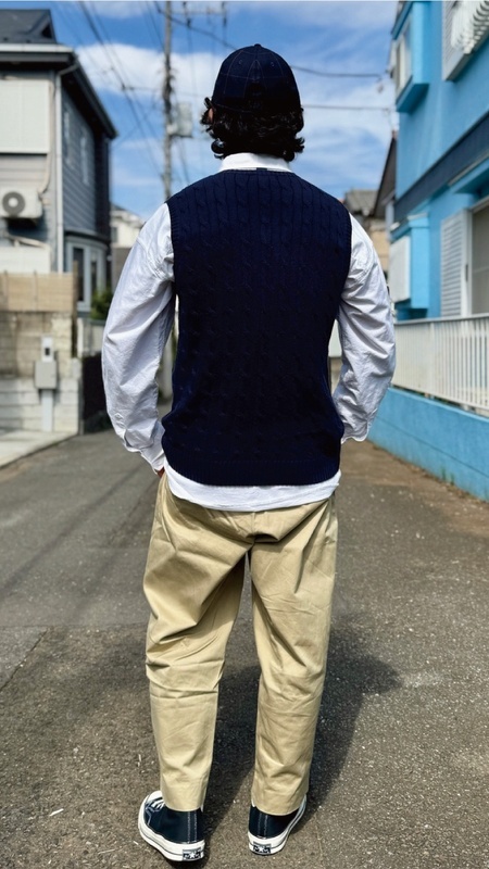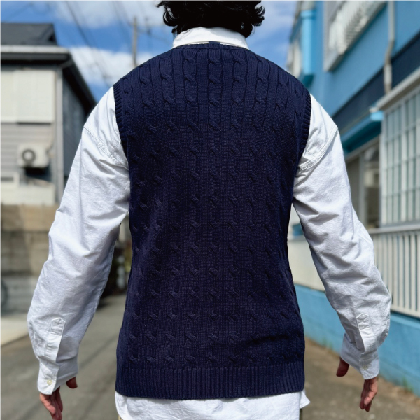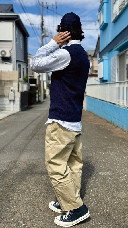 ニットベストに相性抜群な襟付きシャツはもちろん、カットソーを合わせていただいても、様になる着こなしをお楽しみいただけます!