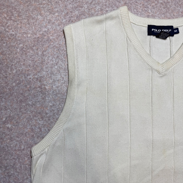 「POLO GOLF RALPH LAUREN(ポロゴルフラルフローレン)」80s 90s Mサイズ USA製 コットン オフホワイト ポニー刺繍 ストライプ ニット ベスト [2516054]