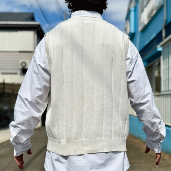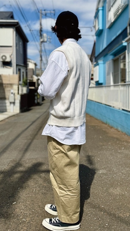 ニットベストに相性抜群な襟付きシャツはもちろん、カットソーを合わせていただいても、様になる着こなしをお楽しみいただけます!