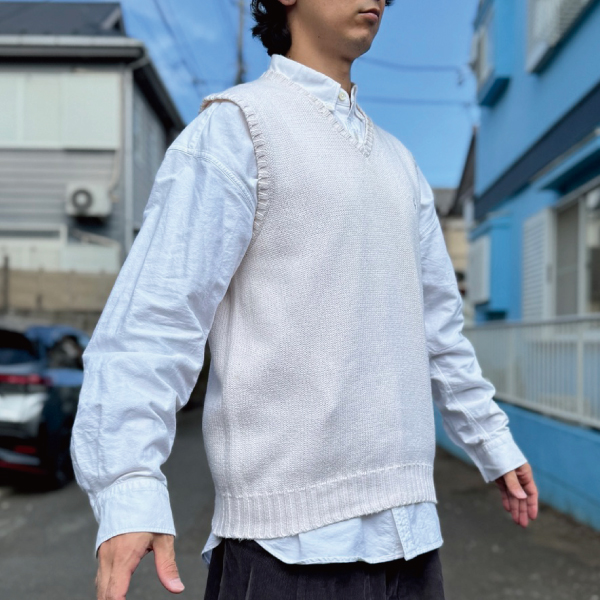 ニットベストに相性抜群な襟付きシャツはもちろん、カットソーを合わせていただいても、様になる着こなしをお楽しみいただけます!