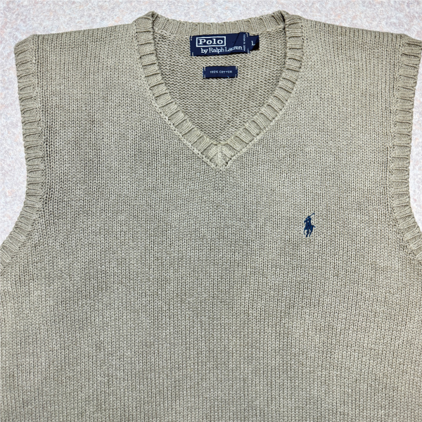 「Polo by Ralph Lauren (ポロラルフローレン)」90s 00s 10s Lサイズ コットン グレージュ ポニー刺繍 ローゲージ ニット ベスト