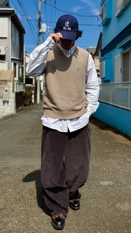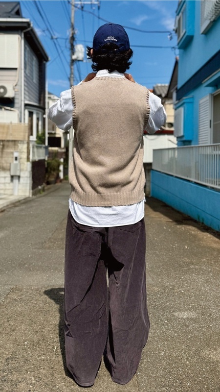 ニットベストに相性抜群な襟付きシャツはもちろん、カットソーを合わせていただいても、様になる着こなしをお楽しみいただけます!