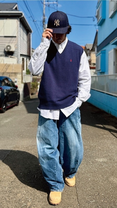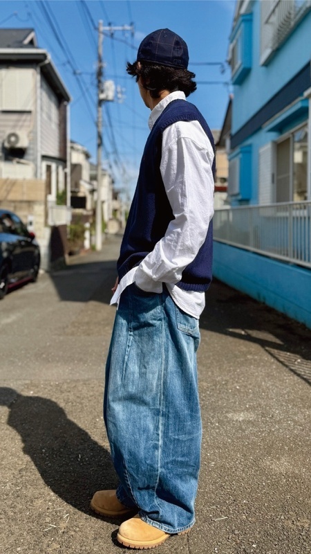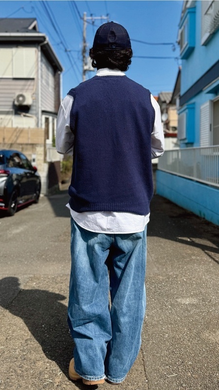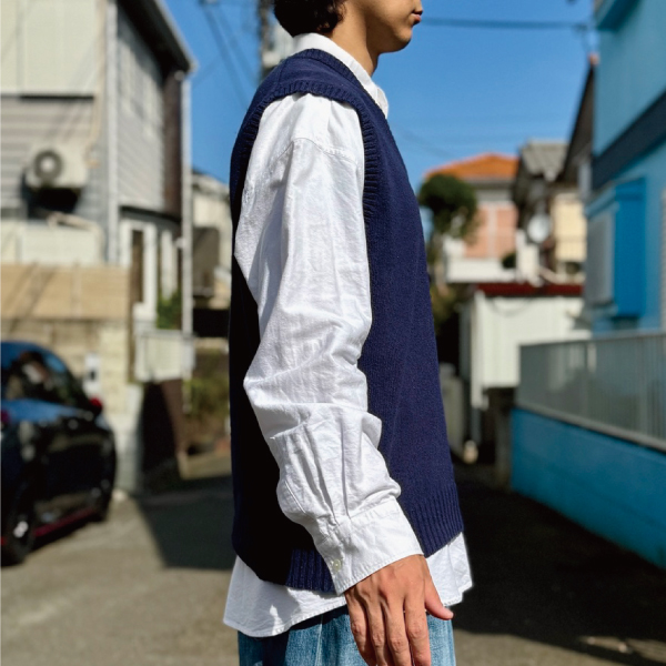 ニットベストに相性抜群な襟付きシャツはもちろん、カットソーを合わせていただいても、様になる着こなしをお楽しみいただけます!