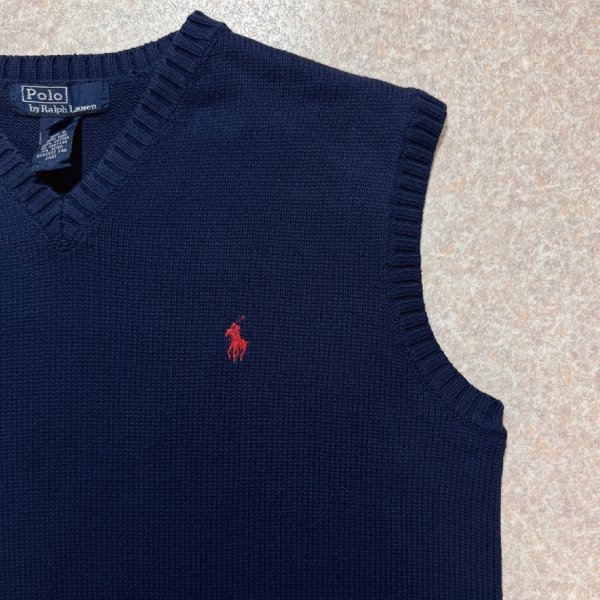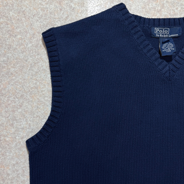 「Polo by Ralph Lauren (ポロラルフローレン)」90s 00s 10s ボーイズ Lサイズ Sサイズ相当 コットン ネイビー ポニー刺繍 ローゲージ ニット ベスト