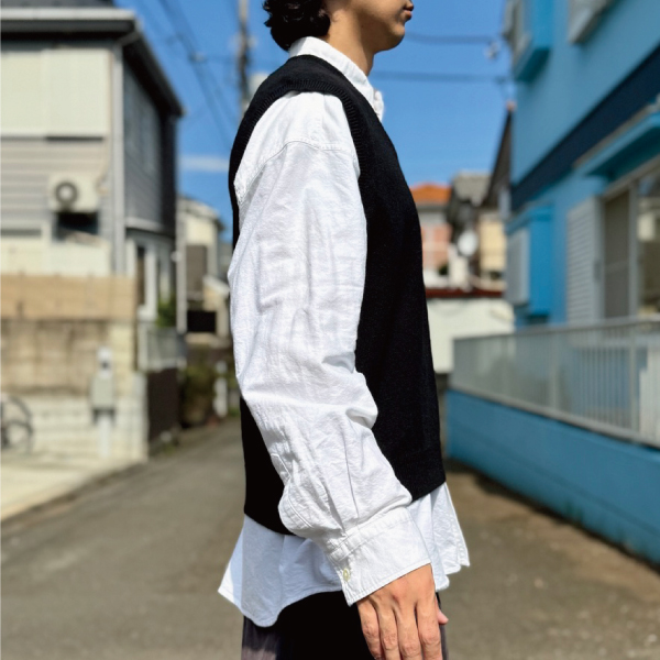 ニットベストに相性抜群な襟付きシャツはもちろん、カットソーやトレーナー、パーカーなどを合わせていただいても、様になる着こなしをお楽しみいただけます!