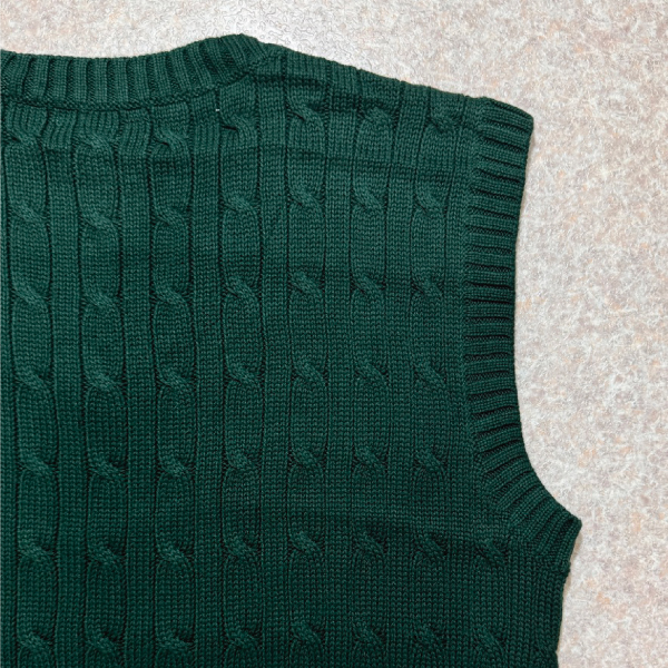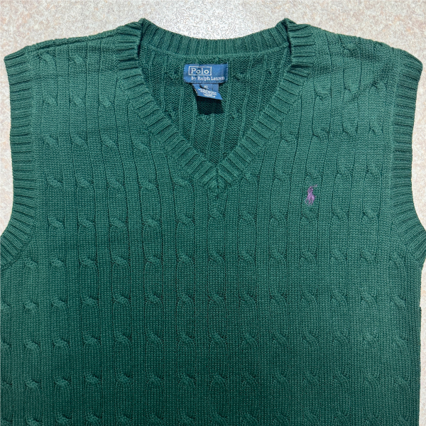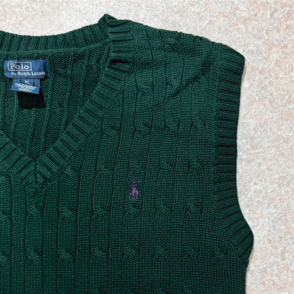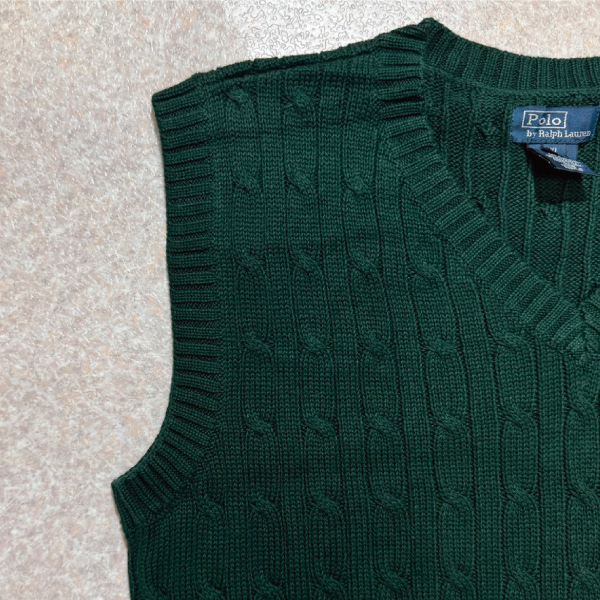 「Polo by Ralph Lauren (ポロラルフローレン)」90s 00s 10s ボーイズ XL Sサイズ相当 コットン グリーン ケーブル編み ポニー刺繍 ニット ベスト [2516077]