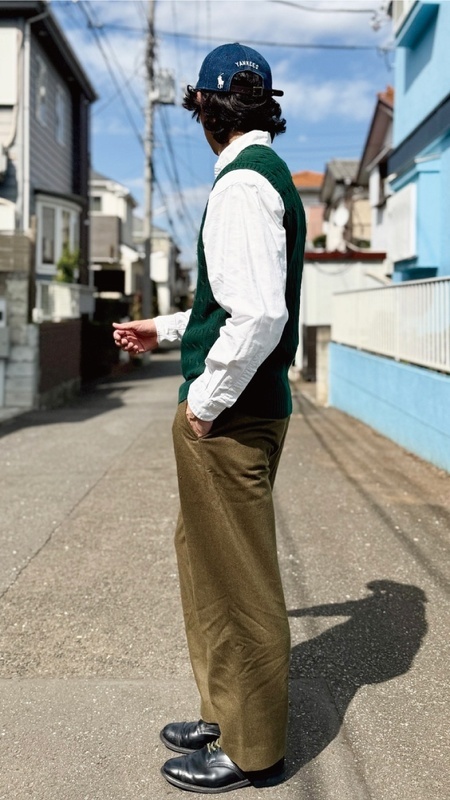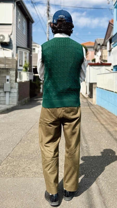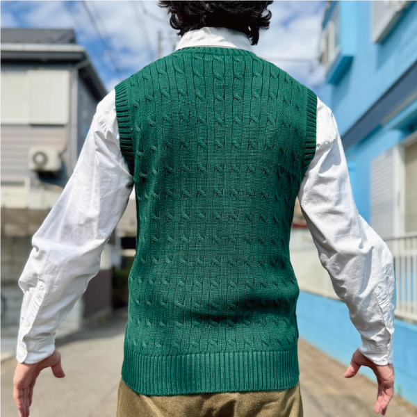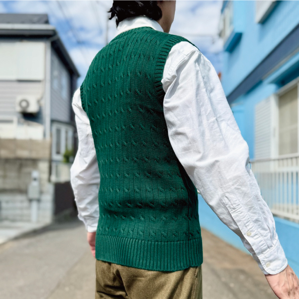 ニットベストに相性抜群な襟付きシャツはもちろん、カットソーを合わせていただいても、様になる着こなしをお楽しみいただけます!