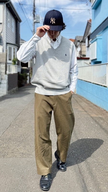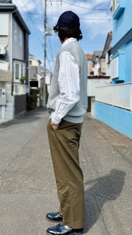 ニットベストに相性抜群な襟付きシャツはもちろん、カットソーを合わせていただいても、様になる着こなしをお楽しみいただけます!