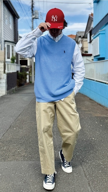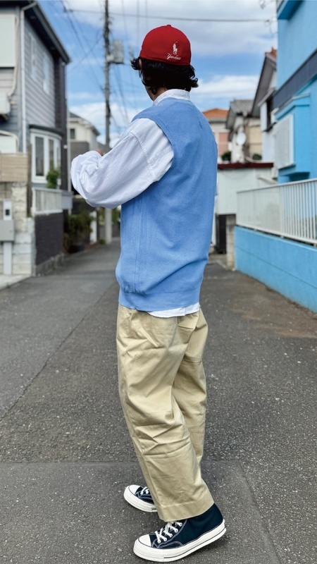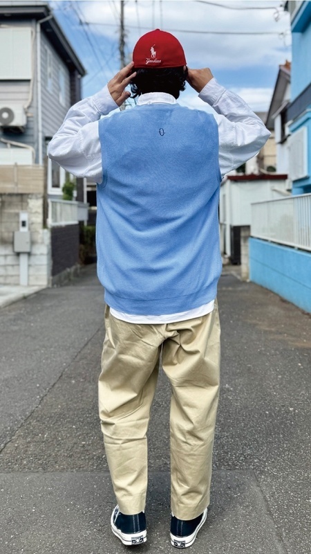 ニットベストに相性抜群な襟付きシャツはもちろん、カットソーを合わせていただいても、様になる着こなしをお楽しみいただけます!