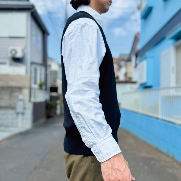 ニットベストに相性抜群な襟付きシャツはもちろん、カットソーを合わせていただいても、様になる着こなしをお楽しみいただけます!
