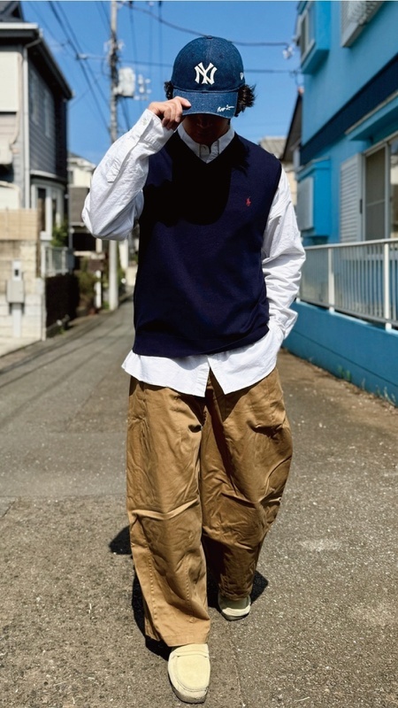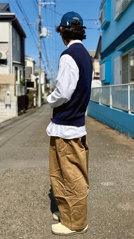 ニットベストに相性抜群な襟付きシャツはもちろん、カットソーを合わせていただいても、様になる着こなしをお楽しみいただけます!