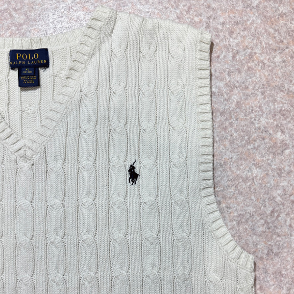 「POLO RALPH LAUREN(ポロラルフローレン)」90s 00s 10s ボーイズ XL(18/20) M〜Lサイズ相当 コットン オフホワイト ケーブル編み ポニー刺繍 ニット ベスト