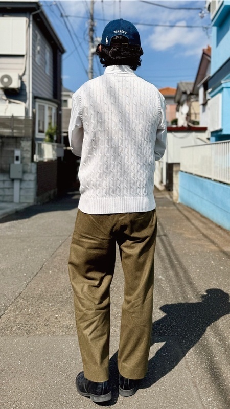 ニットベストに相性抜群な襟付きシャツはもちろん、カットソーを合わせていただいても、様になる着こなしをお楽しみいただけます!